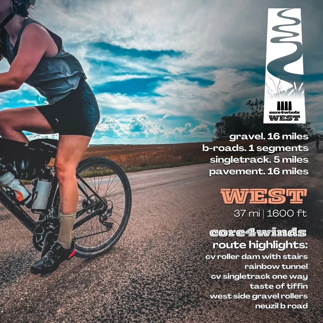 Our 4-part adventure series, core4winds. Each route departs to the North, East, South, or West from the center of Iowa City + features ALL the surfaces. Ride to earn a badge of honor (aka sticker) for each adventure! Simply show your Strava or RWGPS route at @SBB, @WOB, @Geoffs, or the @Bike Library to get the corresponding route sticker. Collect all 4 winds stickers to complete the core4 logo pillars! Once you’ve gathered the full core4 winds logo, snap a pic email us to be registered to win the ultimate surprise + delight: a heli ride with the SkyKing on race day.